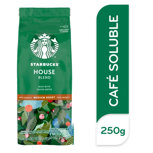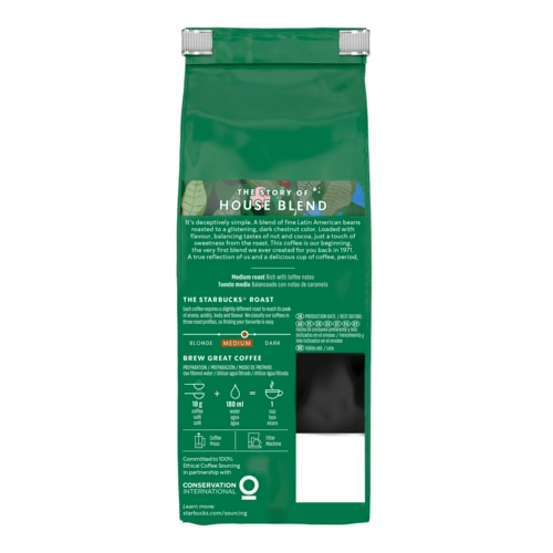 STARBUCKS® House Blend es Café 100% Arabico tostado y Molido. Un verdadero reflejo de STARBUCKS® Equilibrio de sabores de entre nuez y cacao y un toque de dulzura. Tueste medio. • 100% Café tostado y molido • Tueste medio